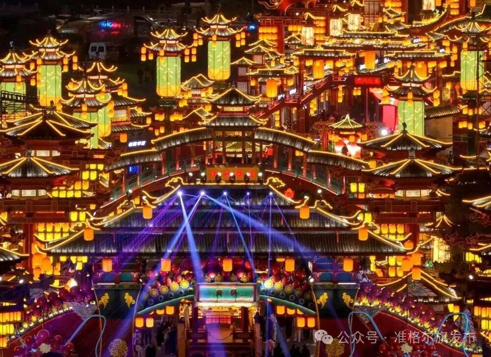 当夜幕降临,准格尔的文旅“链接”更显惊艳。湾Night街区的水上舞台上,《印象·准格尔》实景剧以黄河为幕、山水为景,将漫瀚调文化与现代光影技术交融,演绎出准格尔从远古到当代的文明变迁;千架无人机与创意焰火在夜空勾勒出“清澈的爱只为中国”的璀璨图景,宛如星河坠落人间。美稷·长河里夜未央不夜城更是将“穿越感”拉满。游客身着汉服漫步其间,与“李白对诗”、随“金吾卫巡街”,在古今对话中触摸历史温度。