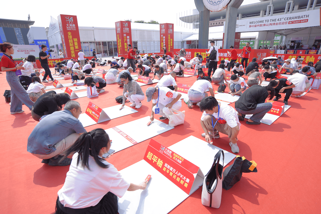 为强化产品体验感知,大角鹿在展会现场同步发起“超平釉超耐磨万人PK大赛”,邀请现场专业买家、专家、业界同行亲自上手,实测大角鹿超平釉瓷砖的耐磨性能,近距离感受超耐磨又超平整“双超”在线的极致质感体验。挑战者排队上阵,现场围观人群接连爆满,高频互动持续点燃展会氛围。