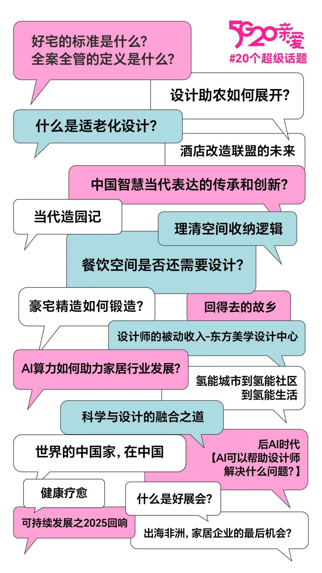 话题不局限,碰撞不设限,一共设不超过20个话题,每个话题请一个话题发起人,邀请话题嘉宾,前期交流论道,收官落在2025广州设计周展会期间,设20个话题圆桌论坛最后收官,展后整理话题内容出版宣发,传递和引起更多的话题研讨。