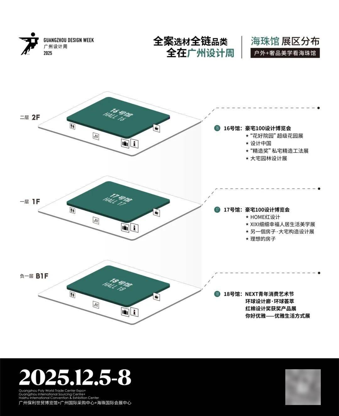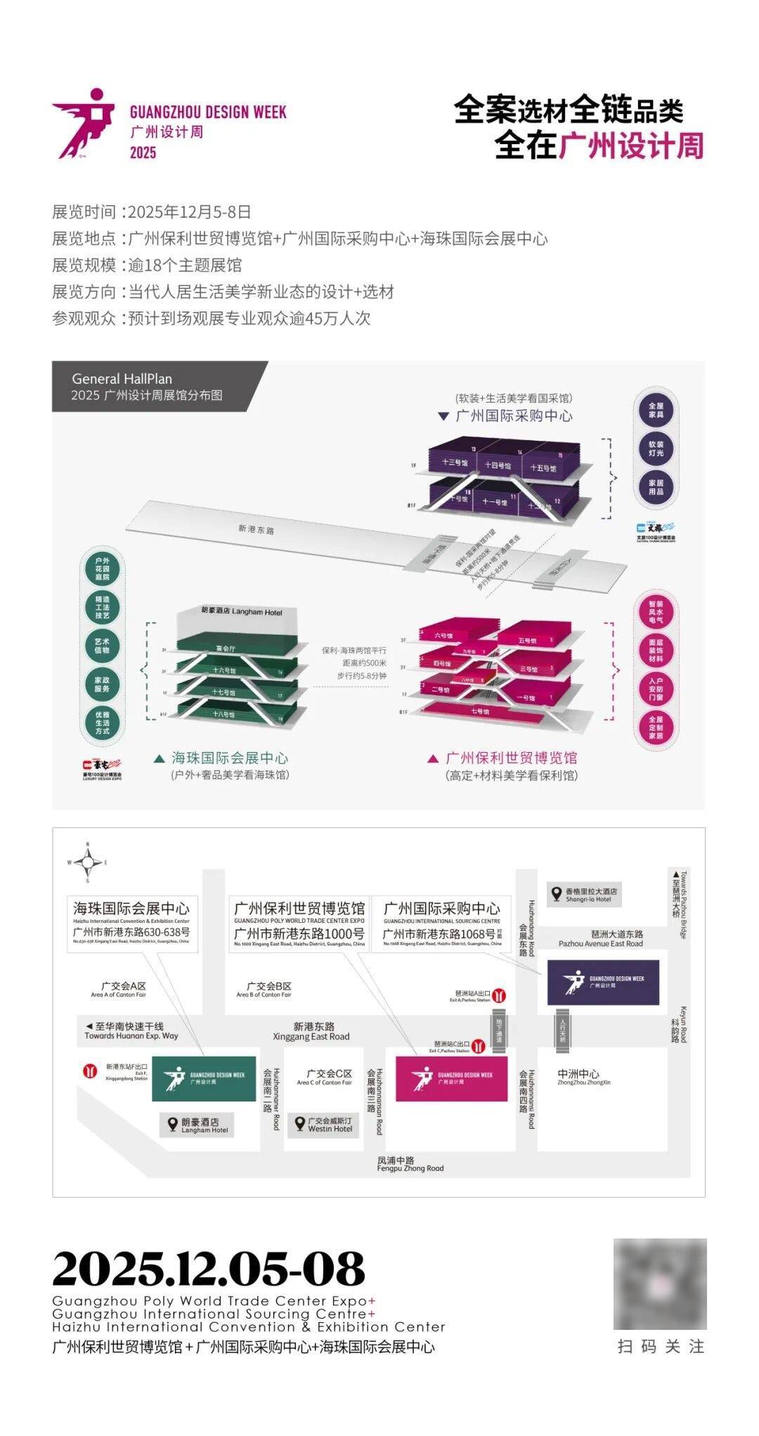 2025广州设计周以“亲爱”为主题,于2025年12月5-8日(四天)在保利馆+国采馆+海珠馆三馆盛大举行,展览方向聚焦“当代人居生活美学新业态的设计+选材”,展览规模达18个主题展馆之多,全球超20+国家的逾1000+家涵盖设计/文创/艺术/潮流/家居/软装/高定/智能/材料/户外/生活方式等领域的领先品牌厂商和机构参展展出,涵盖人居空间全案所需“外装-内装-后装”的超全供应链和服务链,包含:“户外花园庭院—精造工法技艺—智装风水电气—面层装饰材料—入户安防门窗—全屋定制家居—全屋家具—软装灯光—家居用品—艺术信物—家政服务—优雅生活方式”的人居全案选材全链品类,分类设置于保利馆+国采馆+海珠馆,形成“高定+材料美学看保利馆、软装+生活美学看国采馆、户外+奢品美学看海珠馆”的展会格局,逐步完善“全案选材全链品类全在广州设计周”的展会平台构建,为全案设计选材选品搭建一站式营商互动平台。