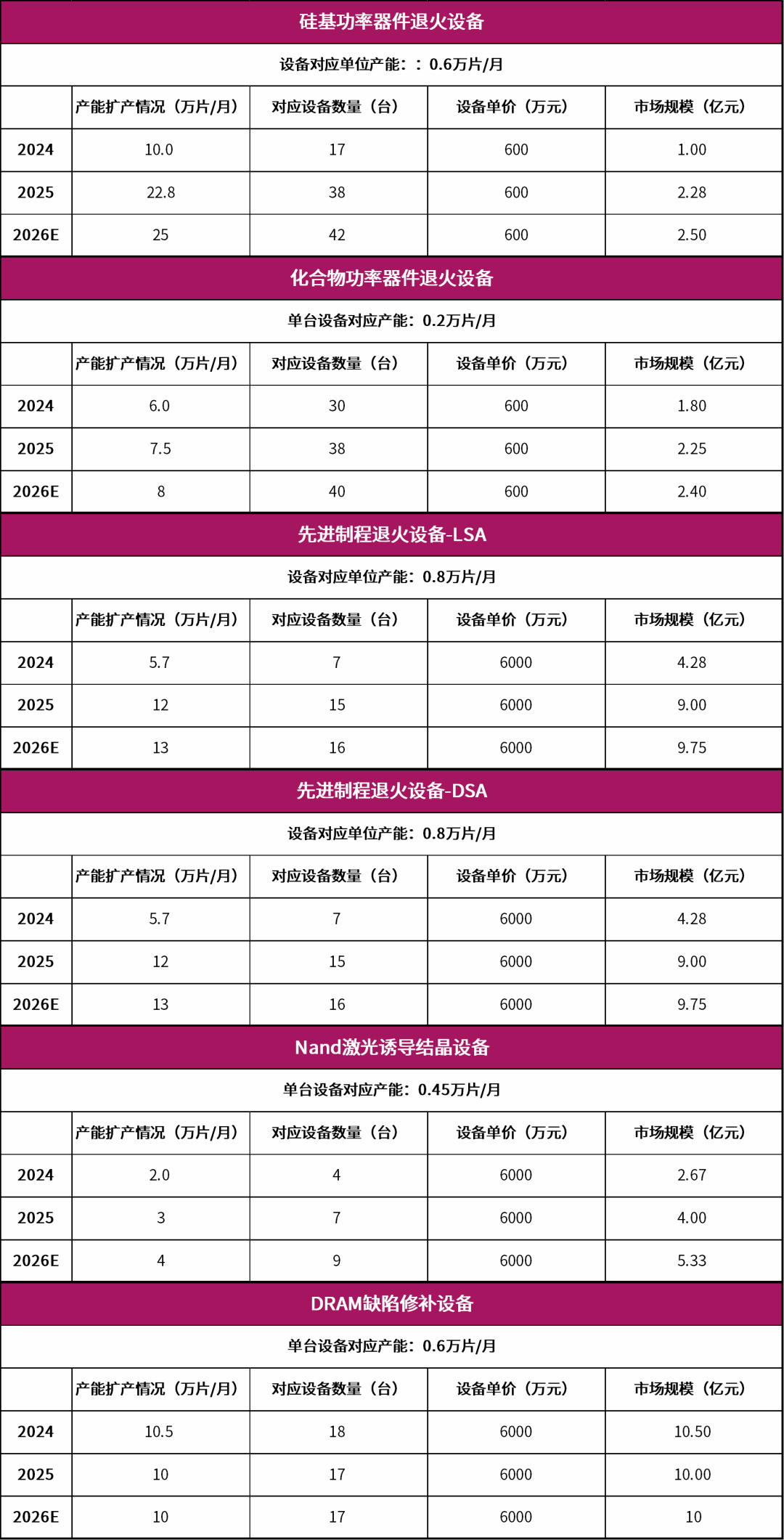 根据前文分析,目前应用于前道晶圆制造的半导体激光设备主要为激光退火设备和激光改性设备,其中根据应用产品不同激光退火设备又可分为功率器件退火设备、逻辑芯片退火设备和存储器退火设备;激光改性设备可分为Nand激光诱导结晶设备和DRAM缺陷修补设备。根据目前国内晶圆厂扩产节奏(2026-2028年预测按设计产能平均分配),具体市场如下: