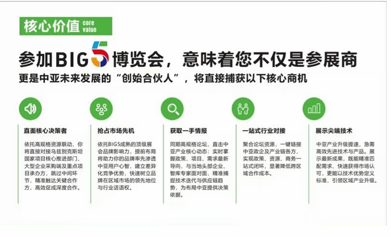 三大核心优势,抢占中亚市场先机 1. 品牌背书 全球资源:BIG5品牌积淀,汇聚中、俄、德等20余国500余家优质企业,超35万专业观众资源